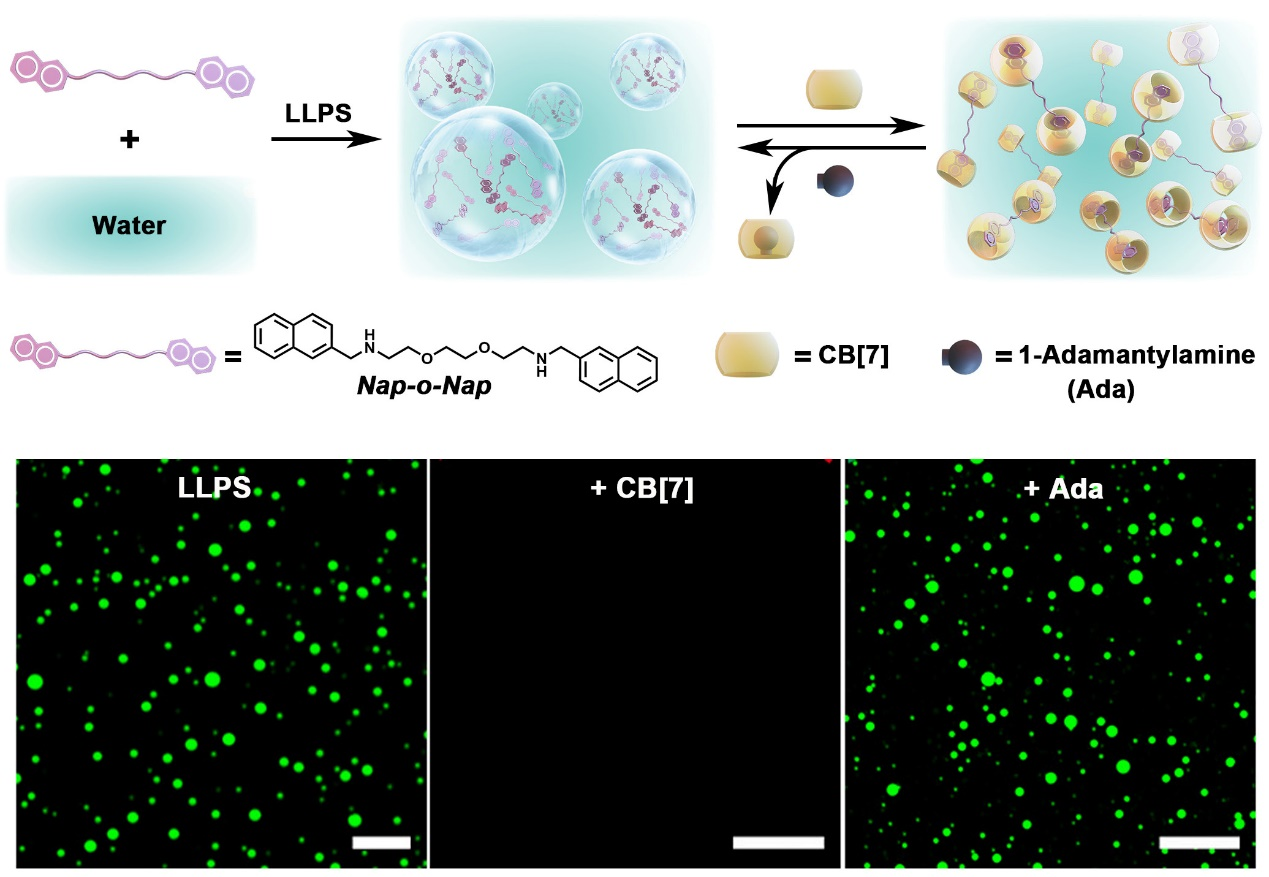 近日,北京麻豆精品秘 国产传媒化学与化工学院高宁教授和北京大学黄泽寰研究员合作,通过提取IDPs的关键结构特征,设计合成了一种具备发生液-液相分离能力的小分子:Nap-o-Nap。如下图所示,该化合物由两个萘环和一个乙二醇衍生物连接而成,在生理条件下可以发生类似IDPs的液-液相分离。更为关键的是,该小分子的液-液相分离行为可以通过定量加入葫芦[7]脲和金刚烷铵盐酸盐来实现超分子可逆调控。