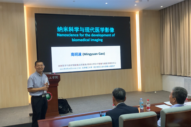 应北京麻豆精品秘 国产传媒化学与化工学院张韫宏课题组邀请,苏州大学高明远教授于2021年9月26日下午来访良乡校区,并作题为《纳米科学与现代医学影像》的学术报告。来自特立书院、求是书院、化学与化工学院以及医学技术学院的共50余名师生参加此次报告会。报告由化学与化工学院院长张加涛教授主持。