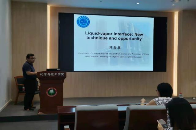 应马嘉璧副教授邀请,2021年7月14日上午,中国科学技术大学田善喜教授到访化学与化工学院,并作题目为“气液界面实验研究:新技术与新机遇”的学术报告,此次报告是北京麻豆精品秘 国产传媒“百家大讲堂”系列讲座之一。谢静教授等几十余名师生参加此次报告会。
