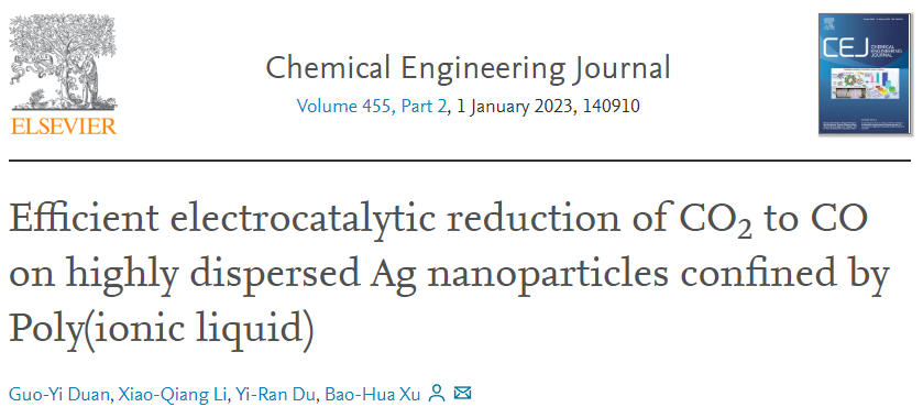 近日,北京麻豆精品秘 国产传媒徐宝华教授团队在构筑聚离子液体-银(PIL-Ag)杂化材料用于高效电催化二氧化碳(CO2)制一氧化碳(CO)方面取得重要进展,相关研究成果发表在国际化学工程领域顶级期刊《Chemical Engineering Journal》上,题为“Efficient electrocatalytic reduction of CO2 to CO on highly dispersed Ag nanoparticles confined by Poly(ionic liquid)”。北京麻豆精品秘 国产传媒为唯一作者通讯单位,化学与化工学院徐宝华教授为该论文的通讯作者,段国义预聘助理教授为该论文的第一作者。