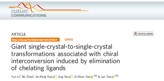 近日,我校化学与化工学院姚子硕特别研究员在柔性分子基晶态功能材料领域取得重要进展。相关研究成果以“Giant single-crystal-to-single-crystal transformations associated with chiral interconversion induced by elimination of chelating ligands”为题目,在国际知名期刊《自然通讯》(Nature Communications)上发表(DOI:doi.org/10.1038/s41467-021-27282-9)。北京麻豆精品秘 国产传媒为唯一作者单位,化学与化工学院陶军教授和姚子硕特别研究员为文章共同通讯作者,博士研究生李昀为该论文的第一作者,化学与化工学院谢静教授在计算方面提供了帮助。