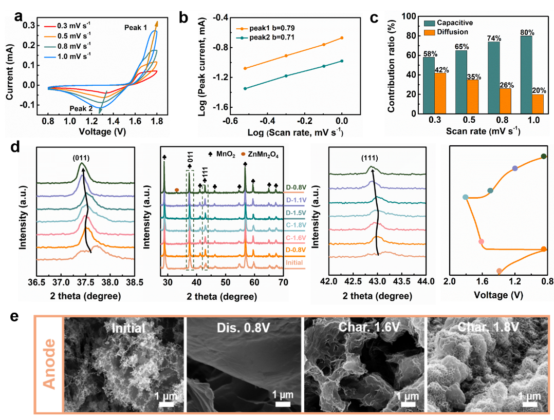 由反应动力学分析可知,Zn//MnO2中的反应动力学由电容行为控制。充放电过程中电极的非原为XRD和SEM图像进一步说明了电池的储能机制:正极发生Zn2+的嵌入脱出过程,负极发生Zn2+的电镀剥离过程。