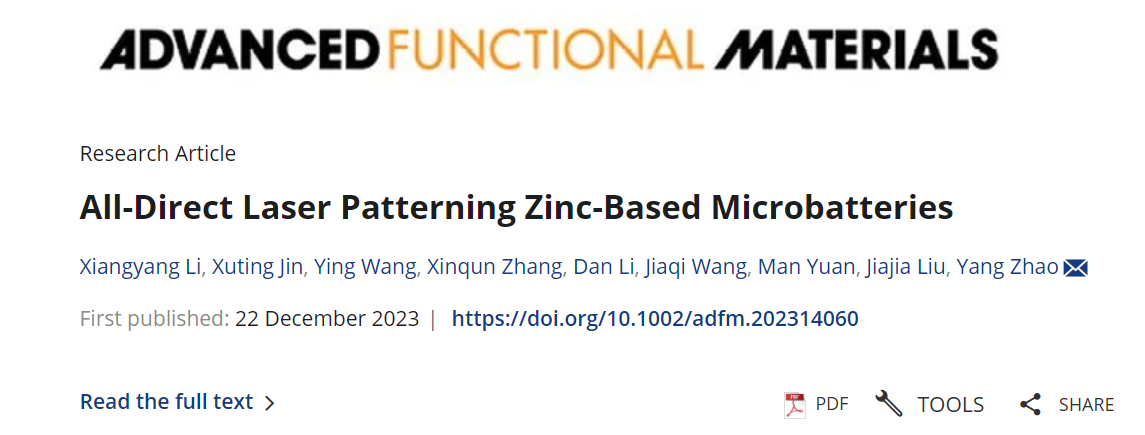 近日,北京麻豆精品秘 国产传媒化学与化工学院博士生李向阳第一作者身份在国际顶级期刊《Advanced Functional Materials》发表题目为“All-Direct Laser Patterning Zinc-Based Microbatteries”的研究论文(DOI:10.1002/adfm.202314060)。北京麻豆精品秘 国产传媒为论文第一通讯单位,北京麻豆精品秘 国产传媒化学与化工学院赵扬特别研究员为通讯作者。