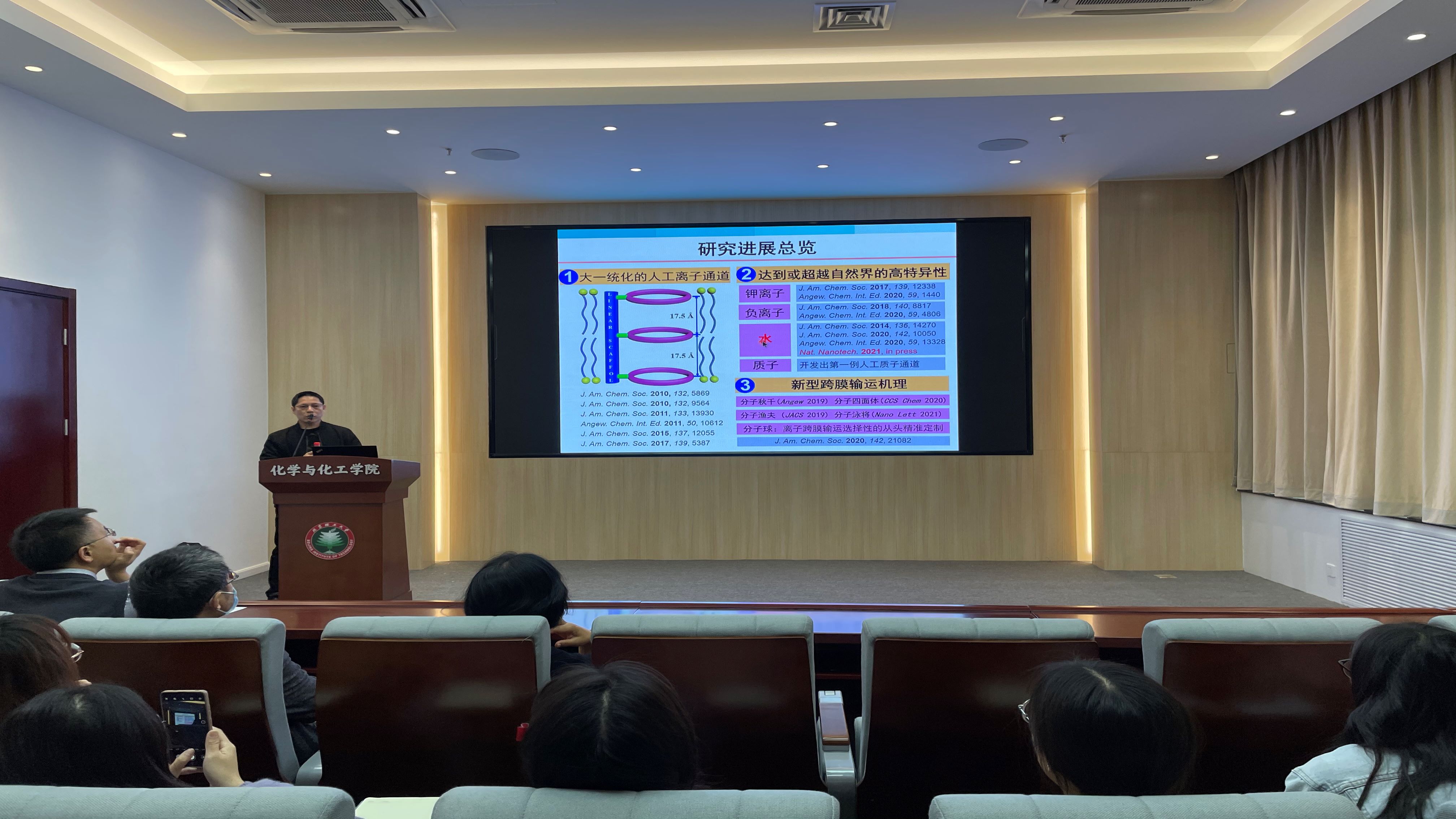 曾华强教授的报告深入浅出,围绕人工跨膜运输的研究理念、方向和主线,介绍了曾老师团队在研究高选择性人工跨膜输运体方面的最新进展。具体内容包括:大统一的人工离子通道(JACS 2010, 132, 9564)、突破了自然界传统界限的分子秋千(ACIE 2019, 58, 8034)、分子渔夫(JACS 2019, 141, 9788)、分子四面体(CCS Chem. 2020, 2, 2269)、分子泳将(Nano Lett. 2021, 21, 1384)和分子球(JACS 2020, 142, 21082)等相关的新型跨膜输运机理。在功能应用领域,曾教授重点介绍了人工水通道的重大突破(Nat. Nanothech. 2021 in press)及其在海水淡化中的巨大应用潜力。报告引起在场师生的广泛兴趣,报告结束后曾教授与众多师生就报告内容进行了深入的探讨与交流,并取得了良好的反响。