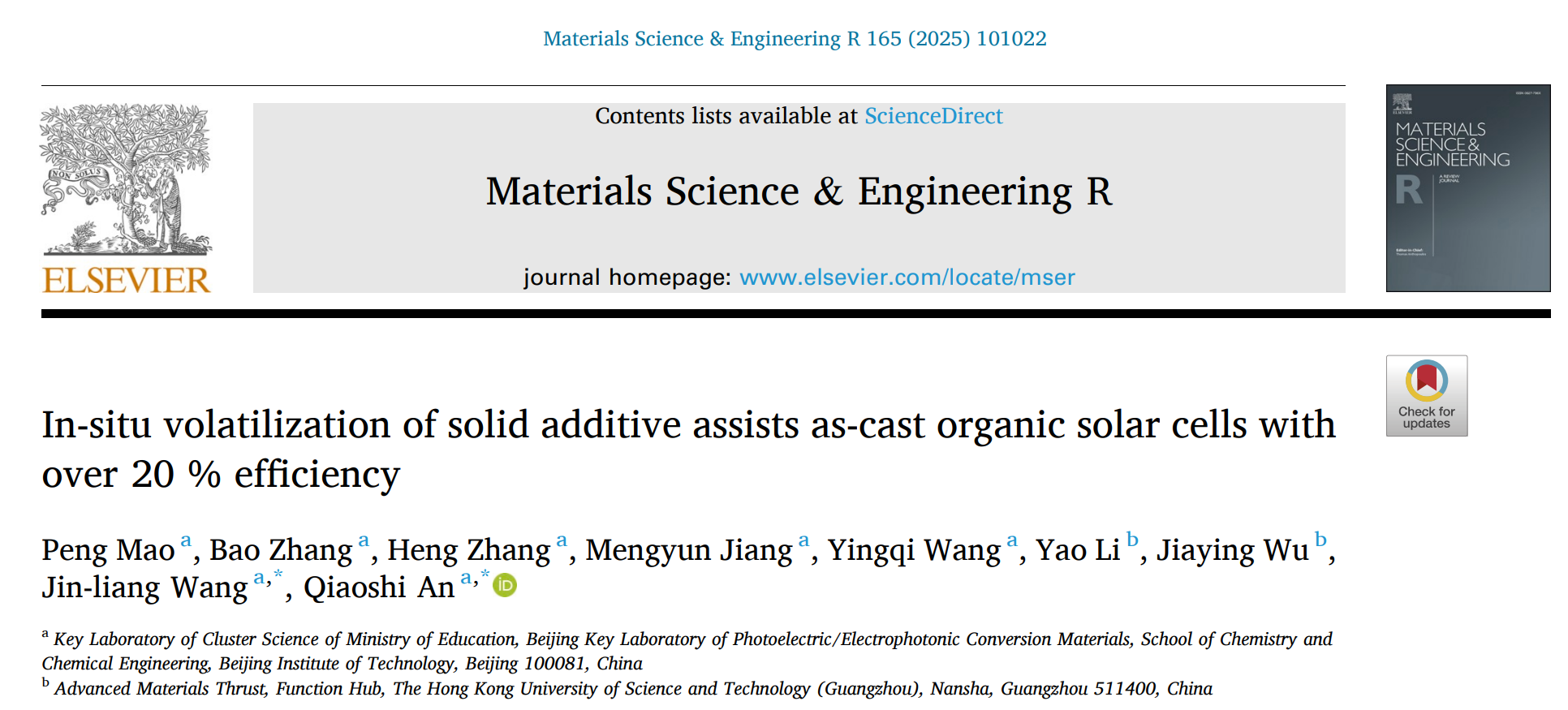 近期,北京麻豆精品秘 国产传媒化学与化工学院硕士研究生毛鹏在材料类国际顶级期刊《Materials Science and Engineering: R: Reports》(IF: 31.6)上发表题目为“In-situ volatilization of solid additive assists as-cast organic solar cells with over 20 % efficiency”的研究论文。北京麻豆精品秘 国产传媒为唯一通讯单位,安桥石特别研究员和王金亮教授为共同通讯作者。