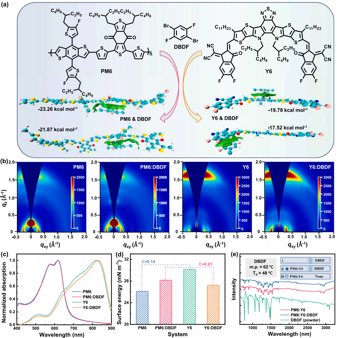 溶液处理的有机太阳能电池(OSCs)以其色彩丰富、半透明、柔性、低成本等独特的优势,在构建集成光电子器件和柔性电子设备方面展现出巨大的应用前景。随着有机半导体和器件工程的不断创新,单结OSCs的功率转换效率(PCE)已达到20%以上,达到了工业化应用的门槛。然而,高性能的OSCs通常依赖于复杂的前处理及后处理技术优化活性层形貌,显著增加了器件的生产成本。此外,复杂的工艺通常会导致器件稳定性、可重复性和与大规模生产兼容性方面的系列问题。因此,开发加工工艺简单,高效的OSCs具有重要意义。铸态OSCs因活性层制备无需附加任何优化工艺,其无疑是降低器件加工成本最有效的方案。此外,铸态器件中材料与器件的构效关系更为直接,有利于推动有机光伏材料的发展。受启发于高挥发性固体添加剂,如果活性层在制备过程中,添加剂能够完全挥发,而无需热退火处理,则器件可视为多组分的铸态OSCs。在这项工作中,该团队将高挥发性固体添加剂DBDF引入不同体系制备了系列器件(图1),并对其构效关系进行了系统研究。