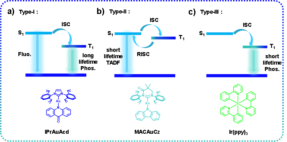 图5. 三种重金属配合物的发光行为。深蓝色方块代表 T1 态,其中绿色部分表示金属在 T1 态的贡献。
