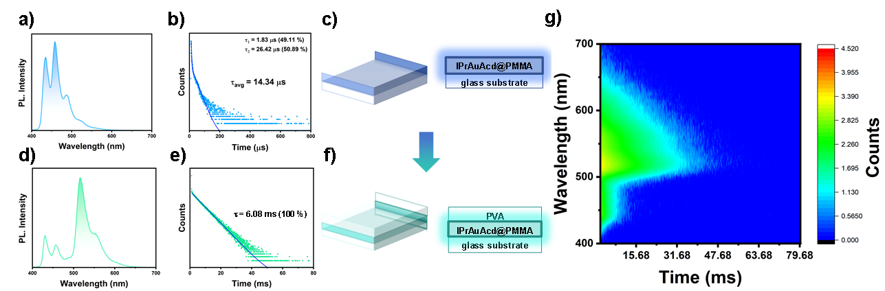 图2. a). 光激活前 IPrAuAcd@PMMA在517纳米处的发射寿命。b). IPrAuAcd@PMMA 的示意图。c). IPrAuAcd@PMMA/PVA在517纳米处的发射寿命。d). IPrAuAcd@PMMA/PVA 的示意图。e). IPrAuAcd@PMMA/PVA 的时间分辨发射光谱。