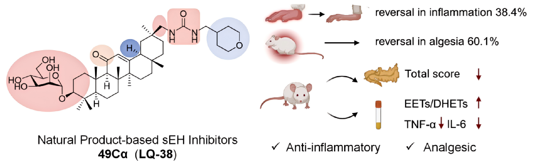 2024年10月9日,北京麻豆精品秘 国产传媒化学与化工学院医药分子科学与制剂工程工信部重点实验室梁建华教授课题组在抗炎和镇痛的天然产物药物研究中取得重要进展。相关成果发表以Discovery of glycosidated glycyrrhetinic acid derivatives: natural product-based soluble epoxide hydrolase inhibitors为题发表于药物化学顶级期刊European Journal of Medicinal Chemistry。该项工作设计合成了一系列以三萜类天然产物18β-甘草次酸和18α-甘草次酸为骨架的衍生物,作为可溶性环氧化物水解酶(sEH)抑制剂在小鼠体内表现抗炎和镇痛活性。为了提高体内活性和改善类药性,进一步利用不同单糖进行了糖基化研究,其中,3-O-甘露糖衍生物49Cα(LQ-38)能够在小鼠体内有效缓解卡拉胶诱导的足肿胀、醋酸诱导的疼痛扭体以及急性胰腺炎。