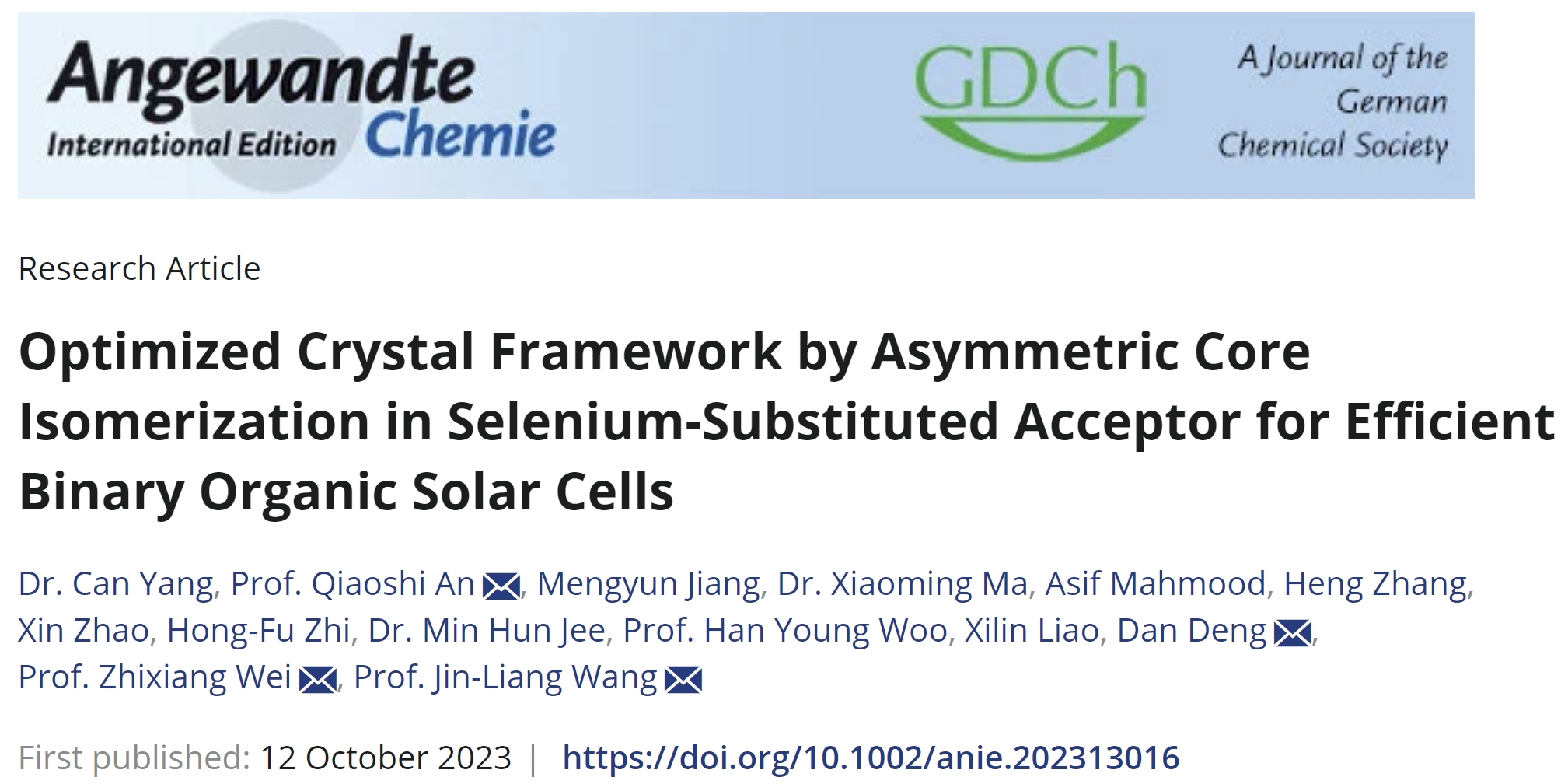 近期,北京麻豆精品秘 国产传媒化学与化工学院王金亮教授团队在新型硒取代位置异构化的小分子受体材料创制及其在高性能有机太阳能电池器件化应用方面取得重要进展。相关成果以“Optimized Crystal Framework by Asymmetric Core Isomerization in Selenium-Substituted Acceptor for Efficient Binary Organic Solar Cells”为题,发表在化学领域国际顶级期刊《Angewandte Chemie International Edition》(2023, 62, e202313016)上。北京麻豆精品秘 国产传媒化学与化工学院王金亮教授、安桥石特别研究员、国家纳米中心魏志祥研究员和邓丹研究员为共同通讯作者,北京麻豆精品秘 国产传媒为第一通讯单位,化学与化工学院博士研究生杨灿为该论文的第一作者。