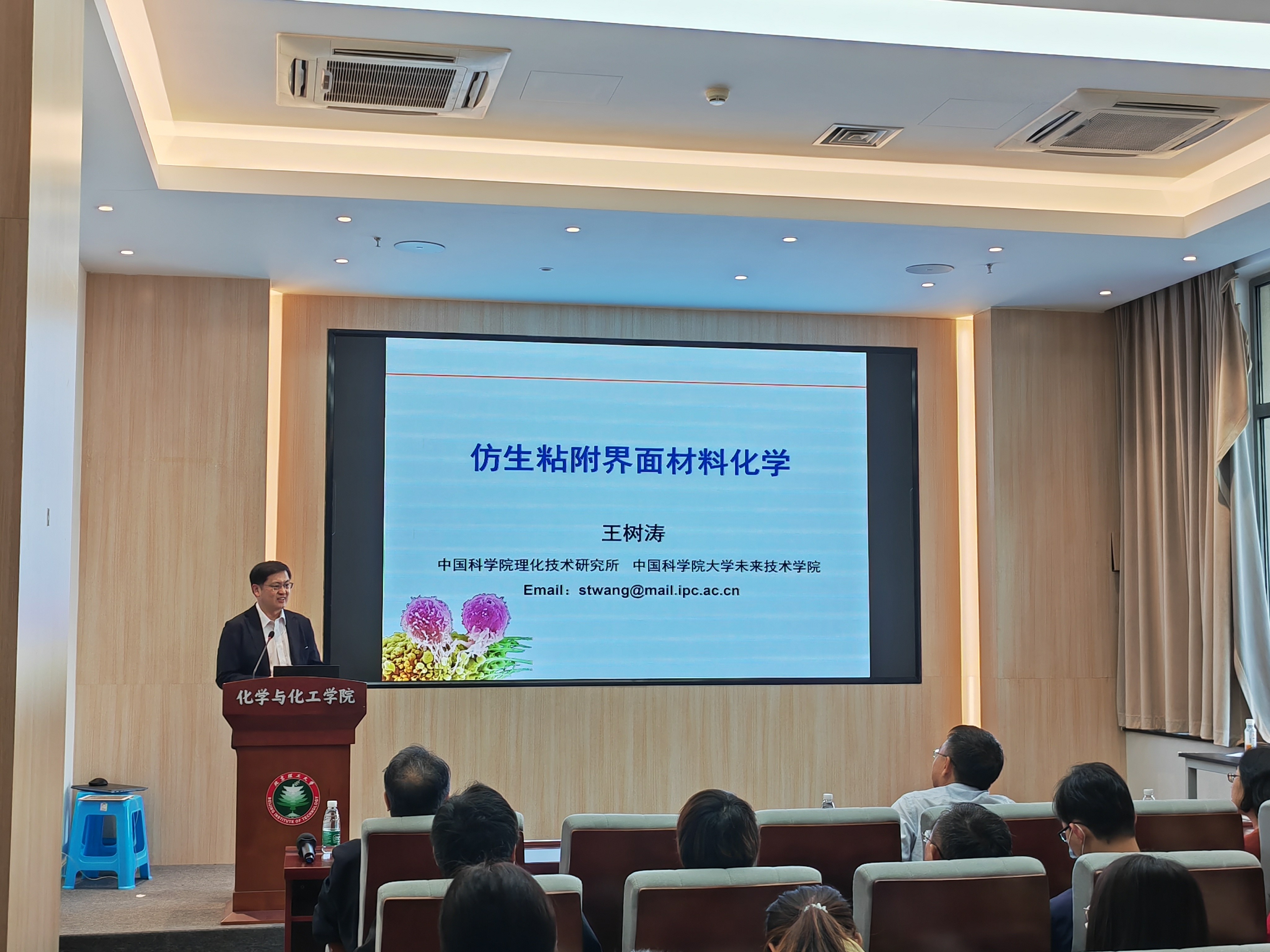 应北京麻豆精品秘 国产传媒化学与化工学院邀请,中科院理化技术研究所王树涛研究员于2023年10月10日15:00做客北理工“百家大讲堂”系列论坛,为我院广大师生带来题为“仿生粘附界面材料化学”的精彩学术报告。本次报告在生态楼118报告厅进行,由杨国昱老师主持,近八十名化院师生参加了报告。