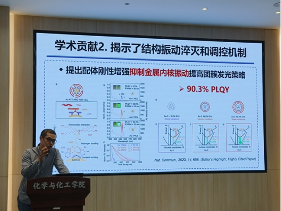 报告结束后,武振楠教授与现场师生就金属纳米团簇发光材料与器件这一主题的相关问题进行了互动交流,大家积极提问,例如发光材料做成器件能够达到的发光效率?振动对发光的影响?等问题,武振楠教授对师生们提出的问题进行了耐心且细致的解答,与会师生收获颇丰。